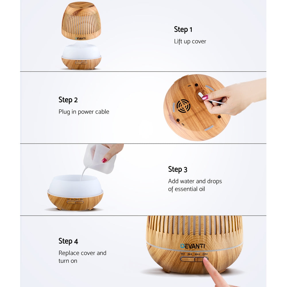 Modern life can be stressful and unforgiving, especially to your health. All the more that you should learn to relax and rejuvenate your senses to face the challenges. And that is where our Devanti Aroma Diffuser can help you, to restore and maintain your aura. With its wood grain design, the diffuser actually performs four functions in one device: humidifier, purifier, night light and aromatherapy. You can set the diffuser to work continuously for up to 12 hours by selecting your choice of intermittent or continuous mist modes. Not least, you can also adjust the level of brightness or select your desired night light colour with its 7-colour LED light to give you soothing hues all through the day or night.