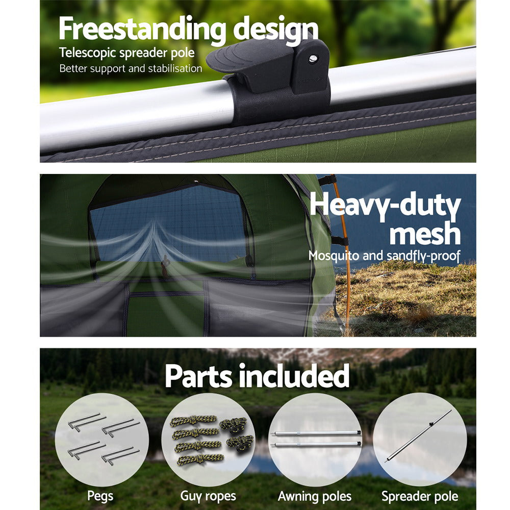 A 14oz 400gsm water-repellent Rip stop canvas cover, 500gsm PVC flooring and an extra 10cm high edge all round. Swagspeak for the ultimate tear-resistant waterproofing. Fully enclosed for privacy with zipped openings for fresh air anytime. Mesh panels to keep insects out. A 70mm high density foam mattress for better sleep on any surface. Thick aluminium support poles to hold up the entire set up.